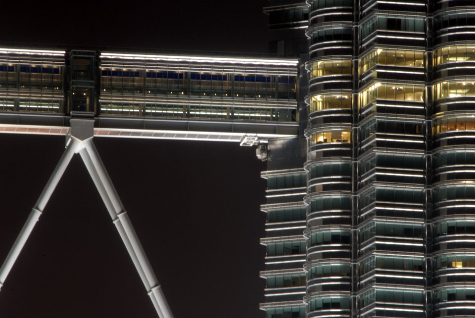 1 Petronas Twin Towers: A view from the Traders Hotel opposite.2 Skywalkway. The double-decker elevators connect the floors (lower deck - odd floors, upper deck - even floors). JapanLondon
