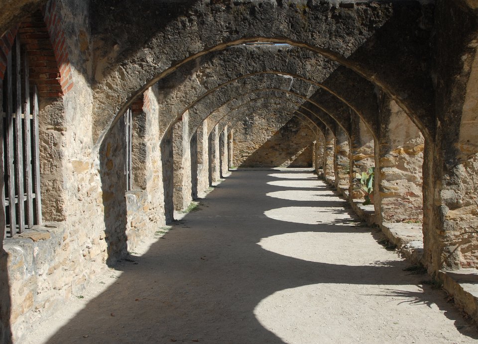 Taken at the Mission San José - San Antonio Texas. The shadow cast through the open-topped arches gave this interesting effect through the arch hallway.